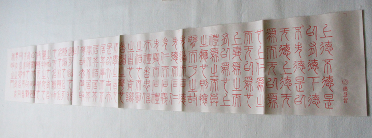 “双一章”(帛书《德道经》德篇第一章和道篇第一章)是老子五千言总纲,是打开老子思想智慧之门的金钥匙,故常诵读抄写不但书法水平会有明显的提高,最重要的是对自身修养的提升及早日实现内文明起到极大提高作用。 以往的抄写经典,大多数因心不够恭敬,步骤不够规范,效用甚微难以达到理想效果。鉴于此,我们本着统一、规范、方便使用的原则,出了“双一章小篆抄写纸”和专用毛笔配备书写。 步骤 一、洗面、漱口 二、三调,将自己的心、身、意调到一个恭敬放松的状态 三、端坐(盘坐最佳),研墨(也可用墨汁)凝神敞怀 四、书写,书写缓慢不宜太快。 五、写毕,以恭敬心收起所写经典(直接处理,或存放高处整洁盒子中择日处理,忌乱扔乱放),工具清洗干净放归原处