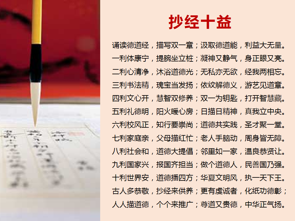 字体大小:1.3cm 使用方法:钢笔直接在上面书写(详见下图示) 作 用:抄写经典、自我提升,书法练习、修身养性。 我们为什么选用小篆来抄写呢?关于这些,熊春锦先生在《龙文化的文明与教育》有明确的论述:汉字是智慧意识教育的重要工具;符、画、图、文,这几类则是慧识教育的工具。在“文”与“字”之间,甲骨文、小篆文等等是向汉字过渡期的工具,具有顺逆双项作用功能。内观诵读采用小篆体,有利于调动阴我首焱与阳我丹元同步内观,故熟练掌握这一字体,培养图文思维效果更佳。 老子《德道经》被誉为万经之王,“双一章”(帛书《德道经》德篇第一章和道篇第一章)又是老子五千言总纲,是打开老子思想智慧之门的金钥匙,故常诵读抄写,不但书法水平会有明显的提高,更重要的是对自身修养的提升以及早日实现内文明起到极大的促进作用。